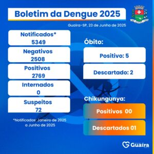 De acordo com o último boletim divulgado pela Secretaria de Saúde de Guaíra por meio das redes sociais da Prefeitura Municipal datado de 23 de junho, o 1º semestre de 2025 fechou com 2.769 casos positivos de dengue. Também foram confirmadas 5 mortes de pacientes em decorrência da doença.