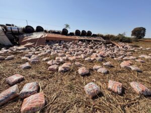 O caminhão transportava uma carga de flocos de milho. Parte da carga ficou espalhada às margens da rodovia. Como o tanque do veículo apresentou vazamento de óleo, um caminhão-pipa da Usina Colorado foi mobilizado para evitar riscos de incêndio.
